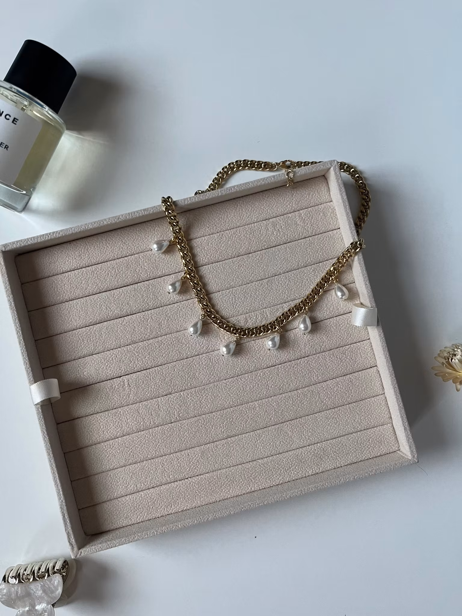 Pearls of Winter necklace guld 239 kr Lägg i varukorgen Produktbeskrivning Längd: justerbart ca 42-46cm. Material: guldpläterat rostfritt stål, vaxade plast pärlor